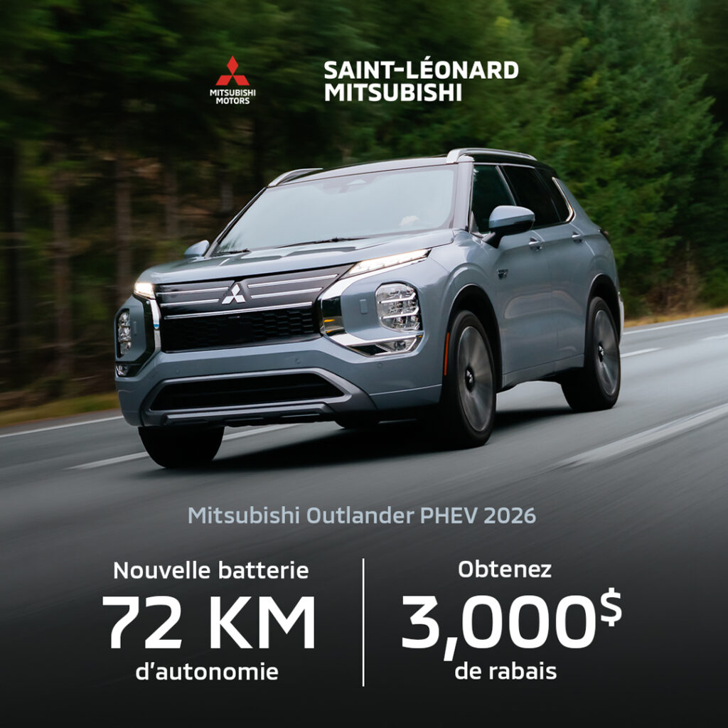 ⁷ Le rabais est offert à l’achat ou à la location d’un véhicule neuf 2026 RVR, 2026 Eclipse Cross, Outlander 2025/2026 ou d’un véhicule 2025/2026 de l’Outlander PHEV de Mitsubishi. Tous les rabais seront déduits du prix final négocié après les taxes pour les achats au comptant et financés et avant les taxes pour les locations.